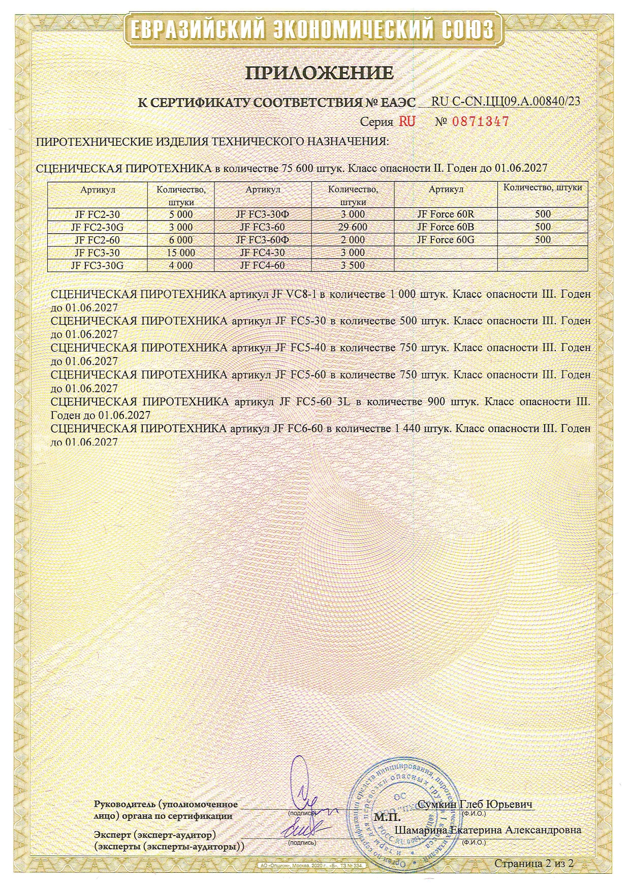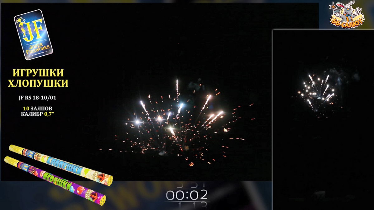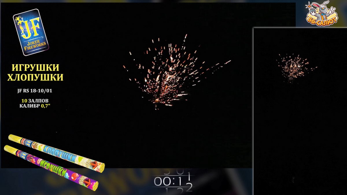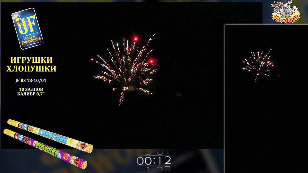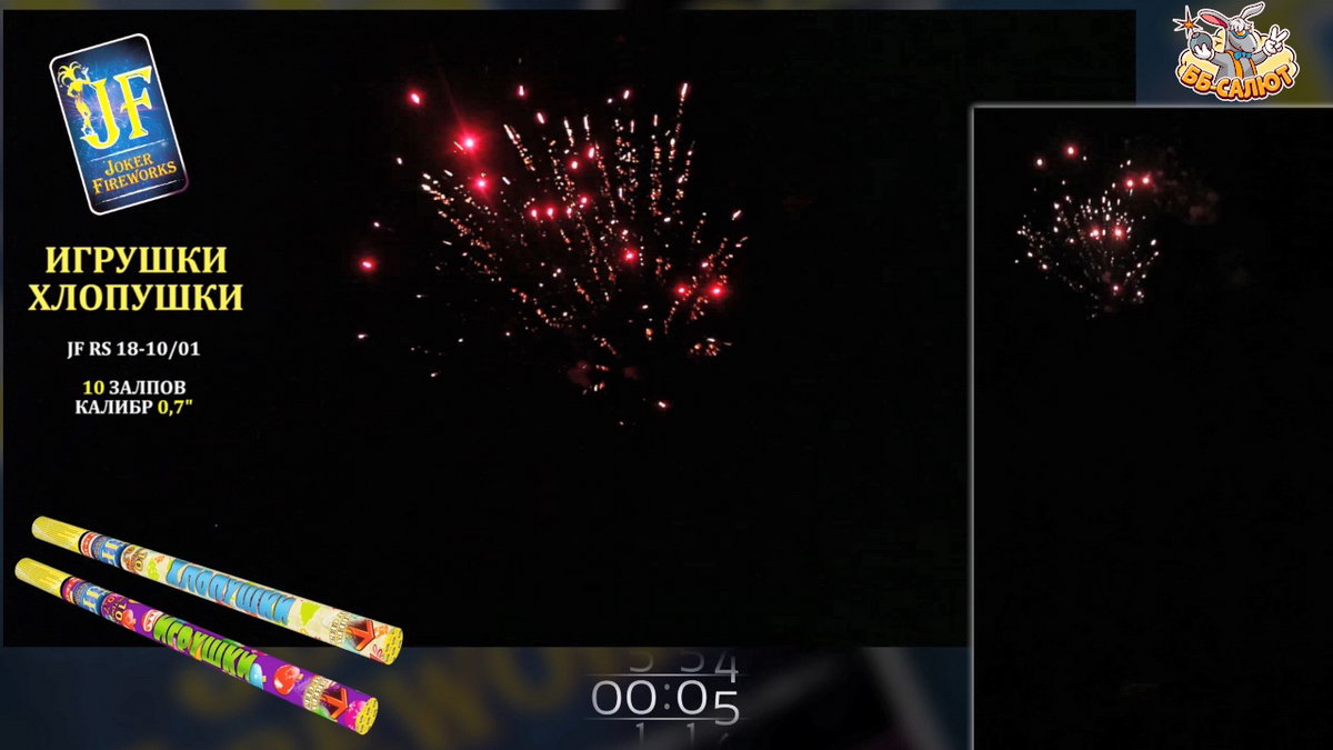 1. Свеча 1 - Серебряная пальма с треском, красная пальма с белым мерцанием, зелёная пальма с треском, красное и зелёное мерцание, хризантема. 2. Свеча 2 - Синий пион с треском, красное мерцание, красно-зелёная пальма с треском, красный пион с зелёным мерцанием.