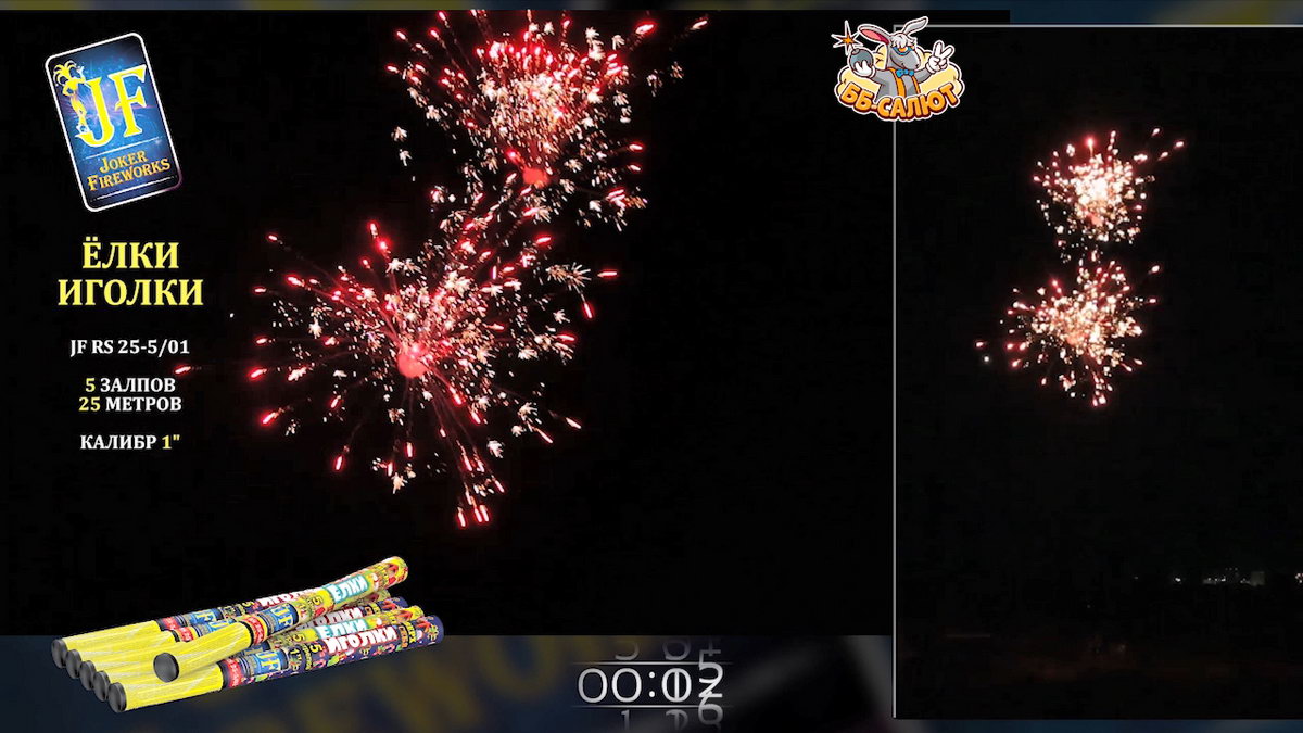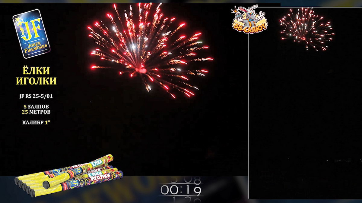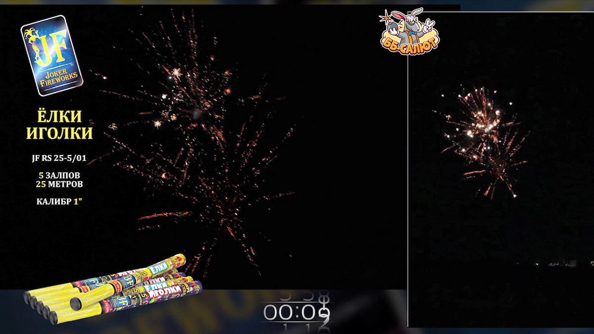 1. Свеча 1 - Цветной пион, фиолетовая пальма с зелёным мерцанием, белое мерцание с красными жемчужинами. 2. Свеча 2 - трещащая пальма, красный трещащий паук, 1000 хризантем.