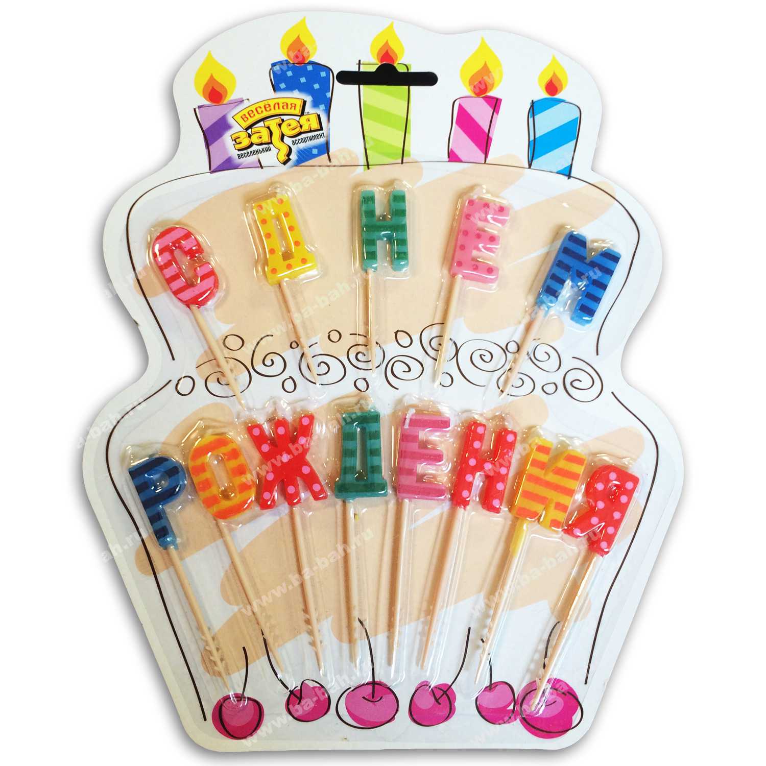 Прекрасно украсят праздничный торт свечи в форме букв "С ДНЕМ РОЖДЕНИЯ" на подставках-пиках. Свечи изготовлены из натурального стеарина.