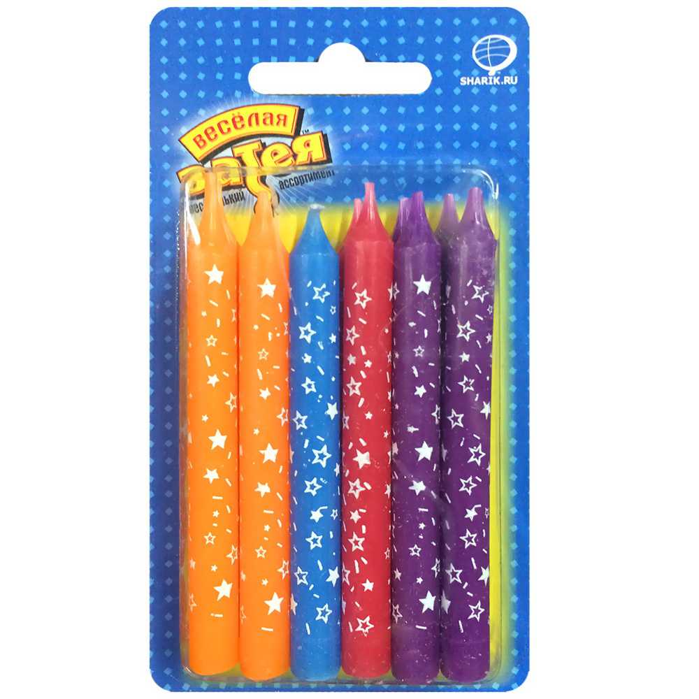 Свечи для праздника, дня рождения или Новогодней ночи. Окрашены в яркие, насыщенные цвета с белым орнаментом из звездочек. Свечи производства компании "Веселая Затея" отличает качественный дизайн, в отличии от обычных свечей это очень изящные и небольшие изделия, которые хорошо подойдут к самому роскошному и вкусному торту..