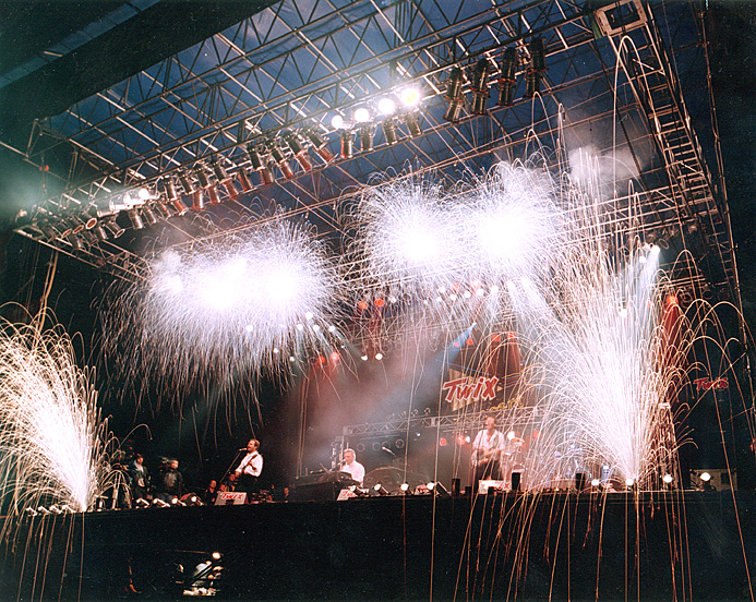 Пиротехнические вспышки применяют существенно реже, чем фонтаны - как правило, на сцене, чтобы подчеркнуть значимые моменты шоу или презентации. Очень часто их используют совместно со сценическими фонтанами.