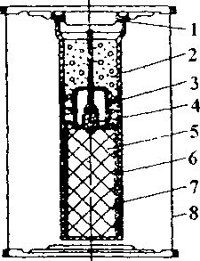 1 — крышка; 2 - асбестовая вата; 3 - решетка; 4 - запал; 5 - пиросостав; 6 - асбестовая прокладка; 7 - оболочка термопатрона; 8 - корпус