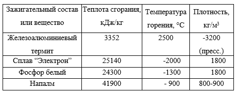 Пиротехнический состав, горение которого сопровождается образованием высокотемпературного пламени и шлаков, обладающих прожигающей способностью. Зажигательные составы (З.с.) применяются для снаряжения зажигательных бомб, снарядов, мин и т.п. К З.с. относятся также огнеметные смеси. З.с. делятся на две группы: содержащие окислитель (термиты и термитно-зажигательные составы) и без него - зажигательные вещества, сгорающие за счет кислорода воздуха (жидкие нефтепродукты, загущенные жидкие нефтепродукты, магниевый сплав "Электрон", белый фосфор, его соединения и сплавы). Все З.с. должны воспламеняться от воспламенительных составов, иметь большую теплоту и температуру горения, сгорать со скоростью, наиболее выгодной в условиях их применения. Скорость горения З.с. зависит от состава и конструкции боеприпаса. Так, сгорание З.с. в зажигательных пулях происходит почти мгновенно, скорость горения запрессованных термитных составов составляет несколько миллиметров в секунду, а жидкие нефтепродукты горят еще медленнее. В таблице приведены основные показатели некоторых зажигательных составов и веществ.