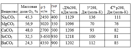 Соли угольной кислоты. Из большого количества солей этого класса в качестве компонентов гетерогенных горючих систем интересны несколько. Основные их свойства приведены в таблице.