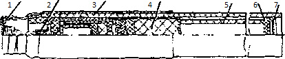 1 - колпачок; 2 - воспламенительное устройство; 3 - пусковая трубка; 4 - ракета; 5 - поджимающая трубка; 6 - картонный кружок; 7 - крышка