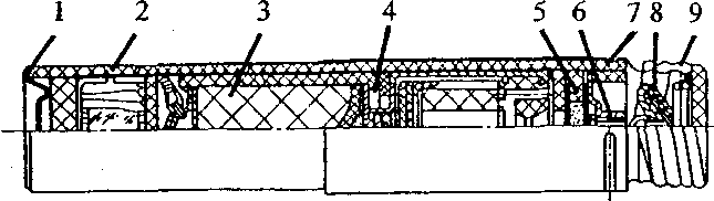 1 - колпачок; 2 - парашют; 3 - ракета с осветительной шашкой; 4 - вышибной заряд; 5 - воспламенительно-вышибной заряд; 6 - воспламенительное устройство; 7 - пусковая трубка; 8 - вытяжной шнур; 9 - крышка