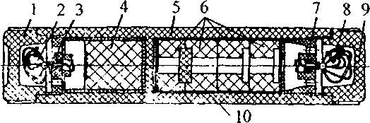1,9 - крышка; 2, 8 - шнур с кольцом; 3,7- воспламенительное устройство; 4 - пироэлемент ночного сигнала; 5 - корпус; 6 - пироэлемент дневного сигнала; 10 - воспламенительная таблетка